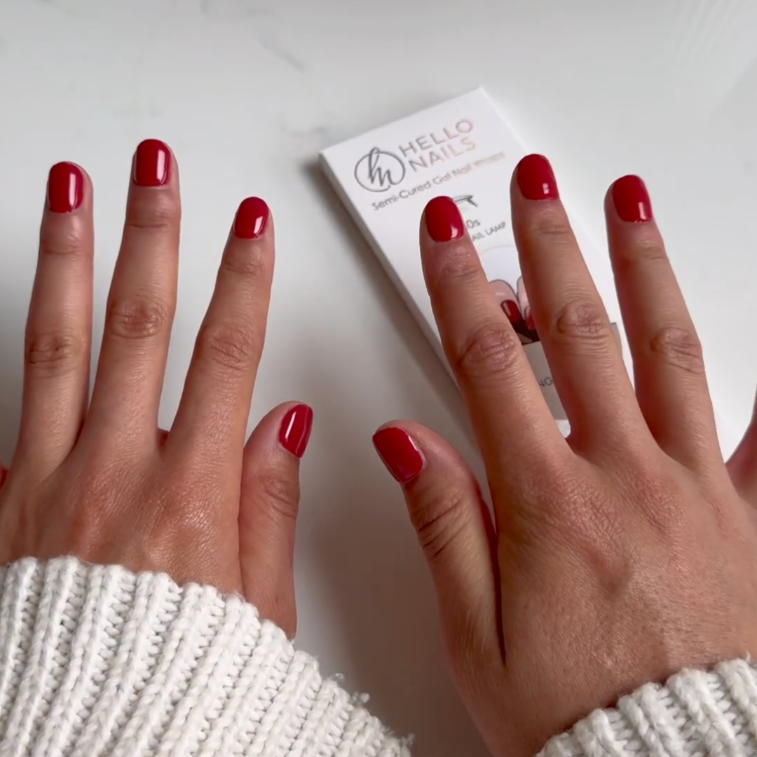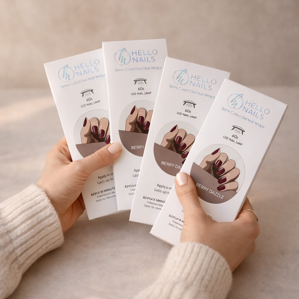 At Hello Nails, my mission is simple: salon-quality nails at home that save you time and money. Our semi-cured gel and stick-on wraps are quick to apply, last for weeks, and contain no HEMA or TPO.